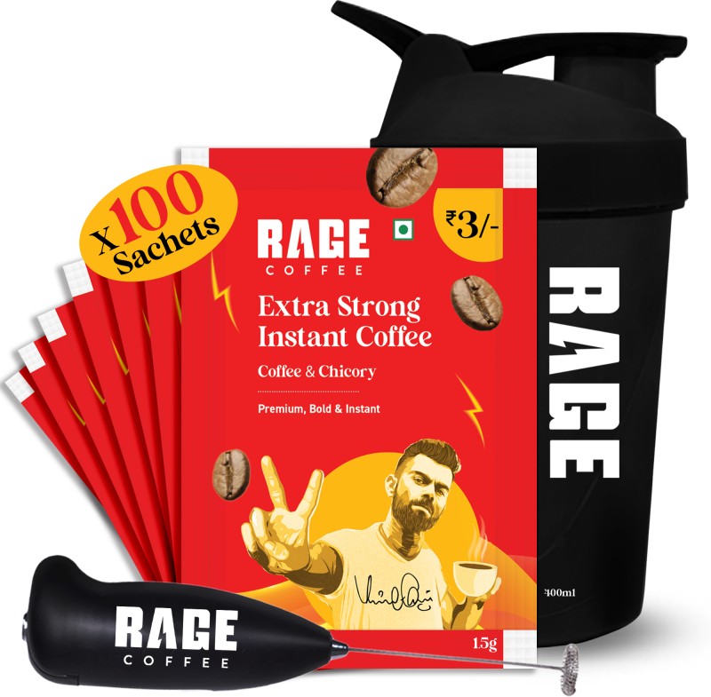 RAGE Extra Strong Premium Blend Coffee Pack of 100+Multipurpose Shaker 450 ml+Frother Instant Coffee(100 x 1.5 g, Assorted Flavoured) is available on flipkart at best discounted online price. Original price of this product is ₹ 1299. You can buy this product at discounted rate ₹ 349.