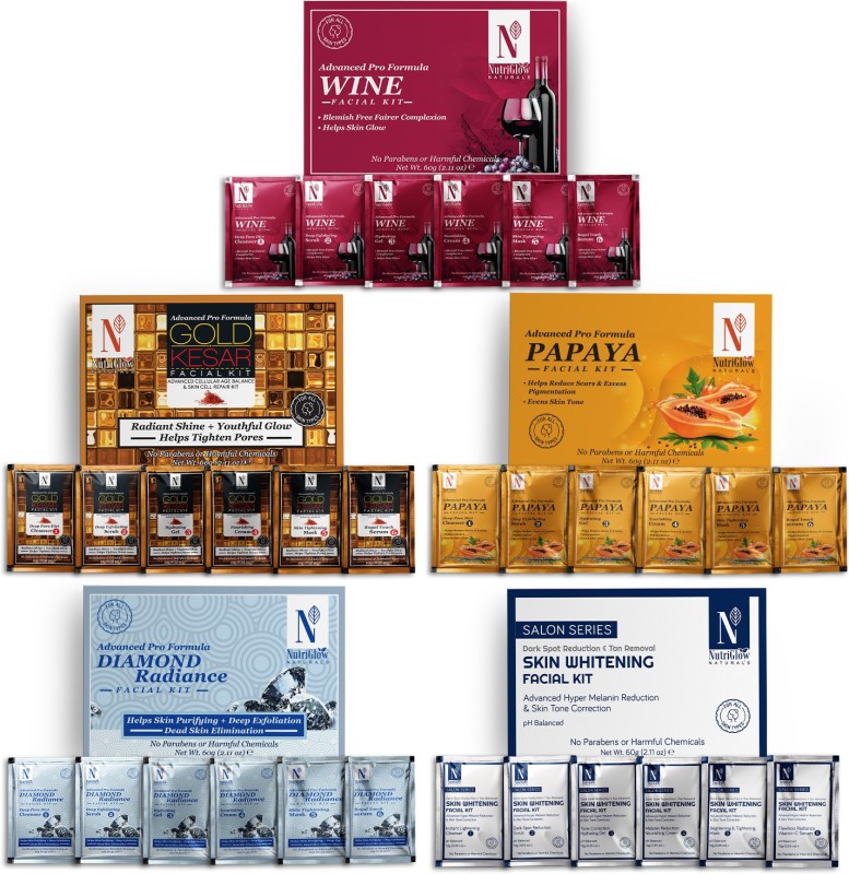 NutriGlow NATURAL’S Advanced Pro Formula Combo Pack of 5 Diamond Radiance,Skin Whitening,Gold Kesar,Papaya,Wine Facial Kit 60gm Each for Skin Cell Repair Reduce Pigmentation & Spotless Face(5 x 60 g) is available on flipkart at best discounted online price. Original price of this product is ₹ 750. You can buy this product at discounted rate ₹ 240.