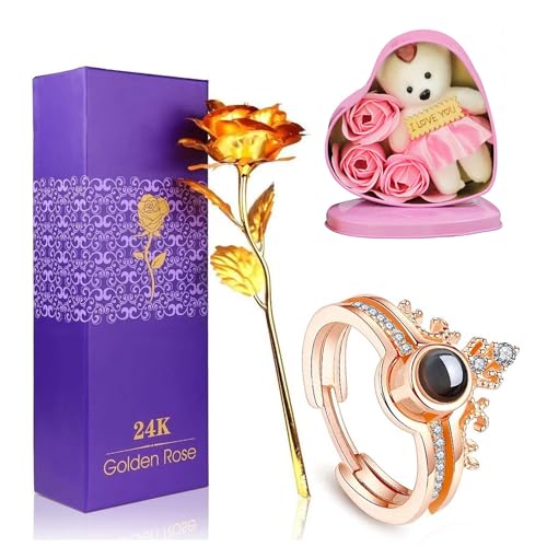 - Package Contains : 1 Ring (100 Language I Love You Ring) + 1 Heart Box with Teddy and Rose + 1 Golden Rose Flower with Box + 1 Greeting Card