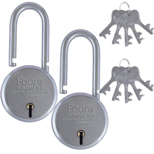 Foora New Round 50mm Lock | Long Shackle | Metal Body | Double Locking | 7 Steel Lever | 5 Silver Keys with Keychain | Silver Finsih | Pack of 2 | Made in India | Export in USA | Canada is available on Amazon at best discounted online price. Original price of this product is ₹ 990. You can buy this product at discounted rate ₹ 200.