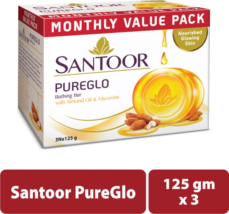 Santoor PureGlo Glycerine Bathing Bar Soap with Almond Oil for Nourished & Glowing Skin(3 x 125 g) is available on flipkart at best discounted online price. Original price of this product is ₹ 540. You can buy this product at discounted rate ₹ 180.