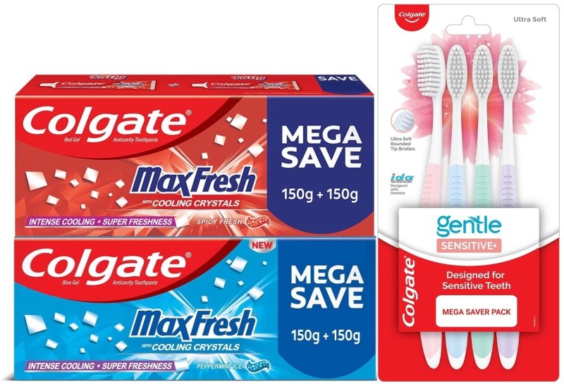 Colgate MaxFresh Red 300g & Blue 300g Toothpaste with Gentle Sensitive Toothbrush 4pcs(1 Items in the set) is available on flipkart at best discounted online price. Original price of this product is ₹ 690. You can buy this product at discounted rate ₹ 310.